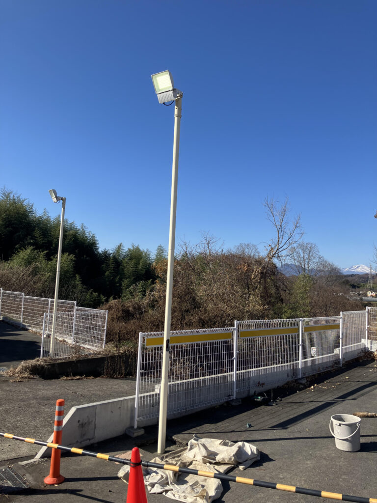 群馬県内の店舗駐車場にて、外灯照明の交換・電気配線工事を行いました。冬の冷たい空気のなか、作業中にふと顔を上げると、